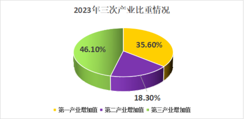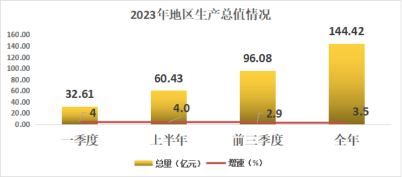 根據地區生產總值統一核算結果,全年我縣實現地區生產總值144.42億元,增長3.5%,增幅比前三季度提高0.6個百分點,比上年同期提高1.9個百分點,分產業看,第一產業增加值51.38億元,增長4.2%;第二產業增加值26.38億元,增長1.3%;第三產業增加值66.66億元,增長3.7%。三大產業比例:35.6:18.3:46.1。