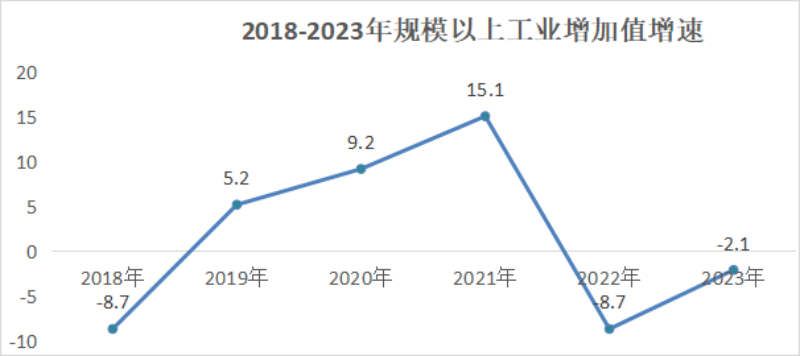 2023年全部工業實現增加值24.56億元,增長4.9%,其中規模以上工業增加值9.07億元,下降2.1%,分行業看,采礦業增加值1.11億元,增長37.6%;制造業增加值4.52億元,增長5.7%;電力、熱力、燃氣及水生產和供應業增加值3.44億元,下降18.8%。分類型看,輕工業增加值3.16億元,增長4.3%;重工業5.91億元,下降5.1%;國有控股企業增加值2.43億元,下降5.3%;非公有工業增加值6.37億元,下降0.9%;大中型工業企業增加值4.33億元,增長5.6%。