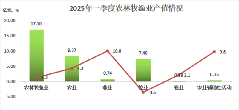 一、農(nóng)林牧漁業(yè)小幅增長。實(shí)現(xiàn)農(nóng)林牧漁業(yè)總產(chǎn)值17.1億元,同比增長1.2%,分行業(yè)看,農(nóng)業(yè)產(chǎn)值8.37億元,增長4.3%;林業(yè)產(chǎn)值0.74億元,增長10%;牧業(yè)產(chǎn)值7.46億元,下降3.6%;漁業(yè)產(chǎn)值0.18億元,增長2.1%;農(nóng)林牧漁專業(yè)及輔助性活動產(chǎn)值0.35億元,增長9.8%。