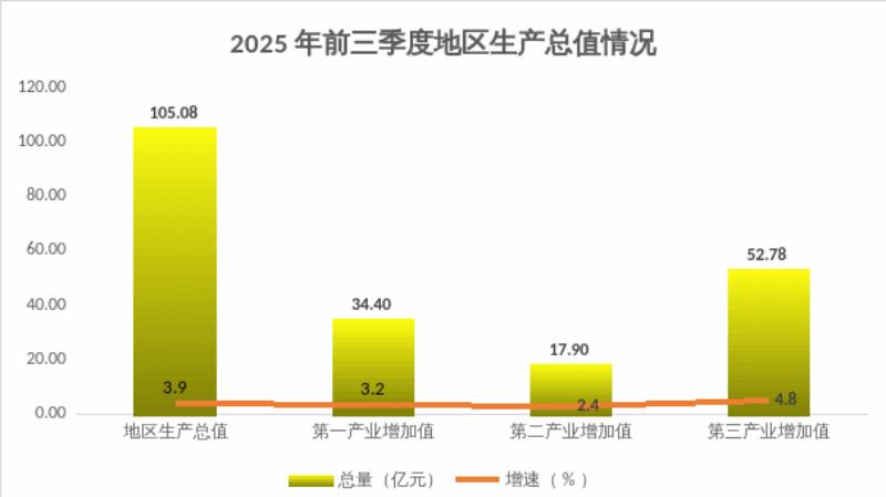 根據清遠市地區生產總值統一核算結果,2025年前三季度,陽山地區生產總值105.08億元,按不變價格計算,同比增長3.9%。其中,第一產業增加值34.4億元,增長3.2%;第二產業增加值17.9億元,增長2.4%;第三產業增加值52.78億元,增長4.8%,三大產業比例:32.7:17:50.2。