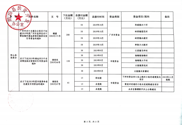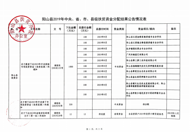陽山縣2019年中央、省、市、縣級扶貧資金分配結果公告情況表