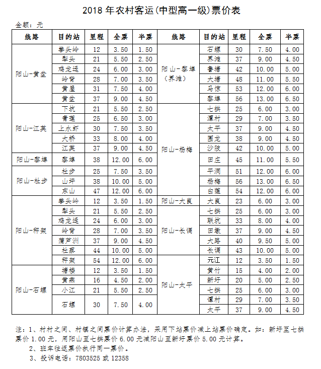 2018年農(nóng)村客運(中型高一級、大型高一級)票價表