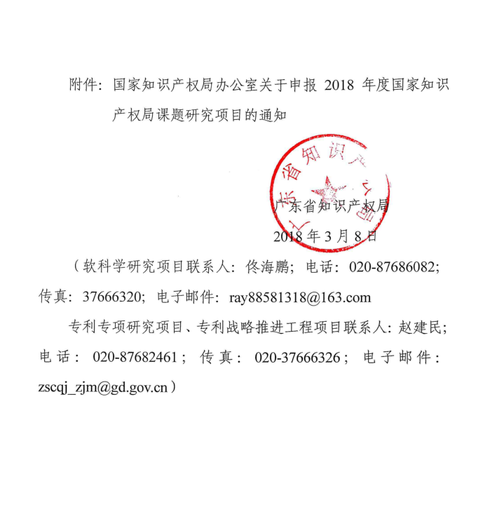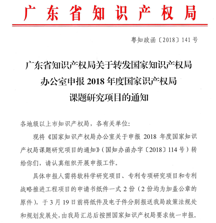 轉發《廣東省知識產權局關于轉發國家知識產權局辦公室申報2018年度國家知識產權局課題研究項目的通知》