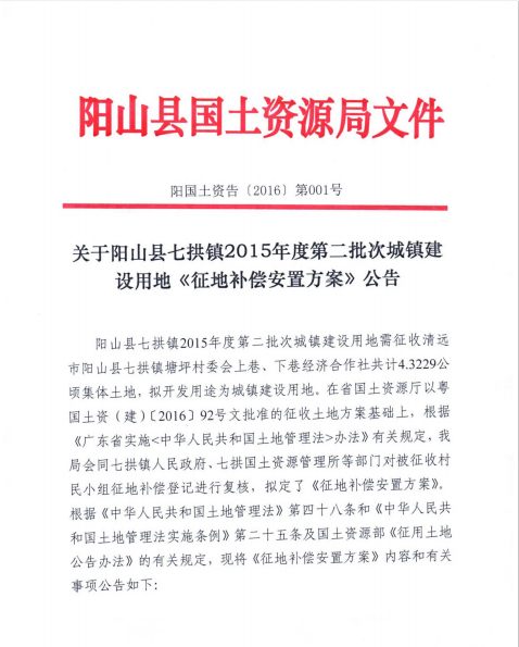 關(guān)于陽山縣七拱鎮(zhèn)2015年度第二批次城鎮(zhèn)建設(shè)用地《征地補(bǔ)償安置方案》公告