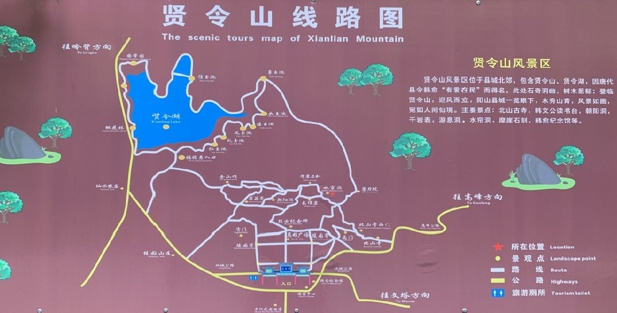 賢令山風景區位于縣城北郊,其得名與韓愈在陽山當縣令有關,當時韓愈將中原文化帶至這里,促進了陽山的經濟發展,正因為他為官一方,造福一方,很快就成為陽山縣家喻戶曉的“賢令”,而他平時讀書活動的地方便稱為賢令山。