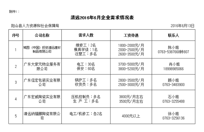 附:1.清遠(yuǎn)2016年6月企業(yè)需求情況表
