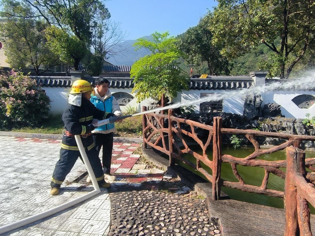 演練后,鄉消防隊員對敬老院工作人員及雙百社工進行技能培訓,現場教學消防栓正確使用方法,并指導火災發生時如何正確連接水帶、噴水滅火要點。