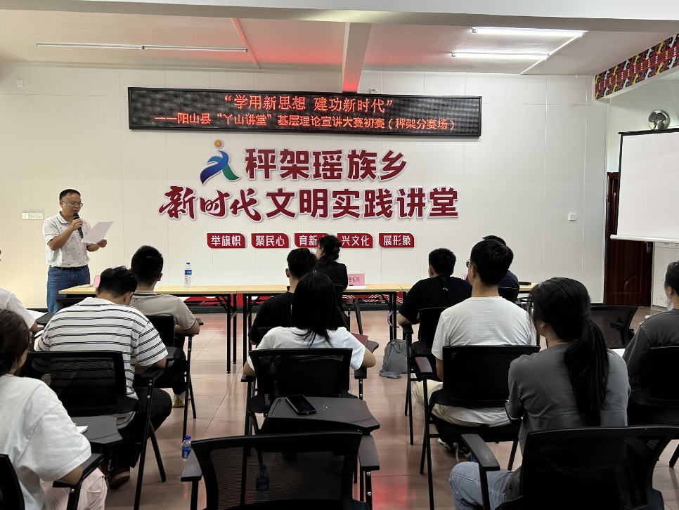 建功新時代”——陽山縣“丫山講堂”基層理論宣講大賽初賽,省社會主義學院駐大陂村第一書記廖昕,鄉黨委委員、宣傳委員唐樂陶,團鄉委副書記甘浩出席活動并擔任評委,來自鄉屬各部門的參賽選手、相關部門負責人、青年干部等30余人參加活動。